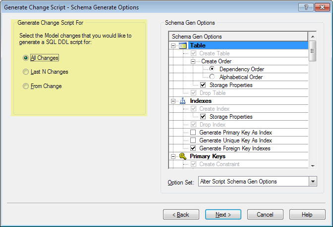 2.The first step is to select the Schema Gen Options that you would like to use. You can generate the SQL DDL script for all the changes that you made this session, the last number of changes that you made, or specify the change that you want to start from.