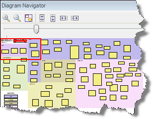 The Diagram Navigator window displays a zoomed out view of the currently active Diagram. The red rectangle represents the portion of the Diagram that is currently being viewed. You can select and drag the rectangle to pan around the Diagram. To zoom you Diagram, you can move the zoom slider thats under the toolbar or resize the red rectangle. Also, you can just click on the Diagram Navigator window to instantly center your view around the clicked location.