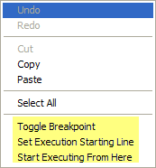 If you right-click in the SQL commands editor, the following menu will appear. You can Toggle Breakpoints, Set Execution Start, and Start Execution on the line you clicked on: