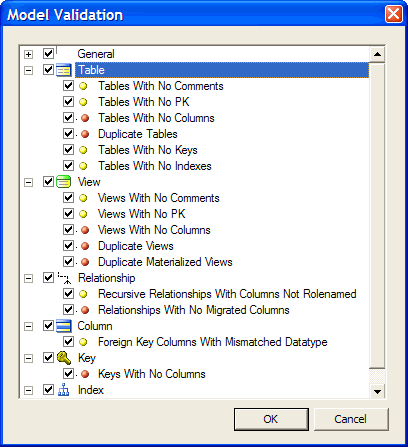 brings up the Model Validation dialog. This dialog allows you to check your model for commonly occurring problems and issues. Entries marked with a red dot