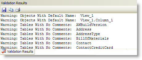 The results of running a Model Validation are displayed in the Validation Results window. When you select an item in this window, the corresponding object is selected. The Validation Results window allows extended selections so you can select multiple items and make changes to them all at once (using the Property Browser).